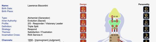 I now refer to my Human Design Map daily in my mediation, and check in with Yury for subsequent 30 minute sessions for a deeper understanding of the symbols and numbers (see just the top part of mine below).  Trust me; I'm not one to trust the non-measurables, non-visibles, and non-tangibles, but I really