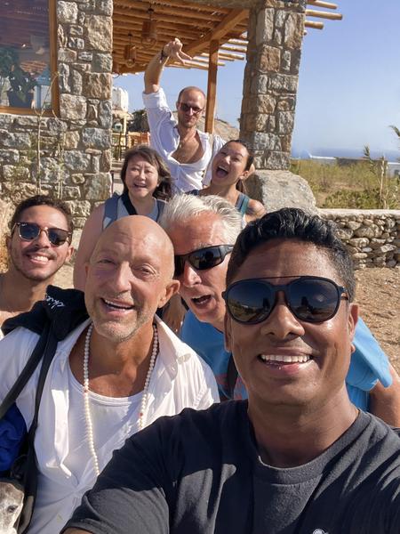 At right, a fall group shot from presenter and friend celebrities visiting Mykonos: from top moving left to right: birthday boy Yury Rockit, Yoga Superstar Ann-See, HIIT specialist and Asian PT of the Year Kimbeley Yap, Arturo Irizarry, Yours Truly, Mr. Kim, Mr. Biskit, and Daily Muscle Malaysia Owner Noel Chelliah.